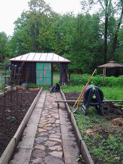 Otherwise, this is where I’ve been and where I’ll be. The magic triangle of the screened in tent, the garden shed, and the garden. The fence – at least one side – is slated to go up this year. The gate went in this weekend.